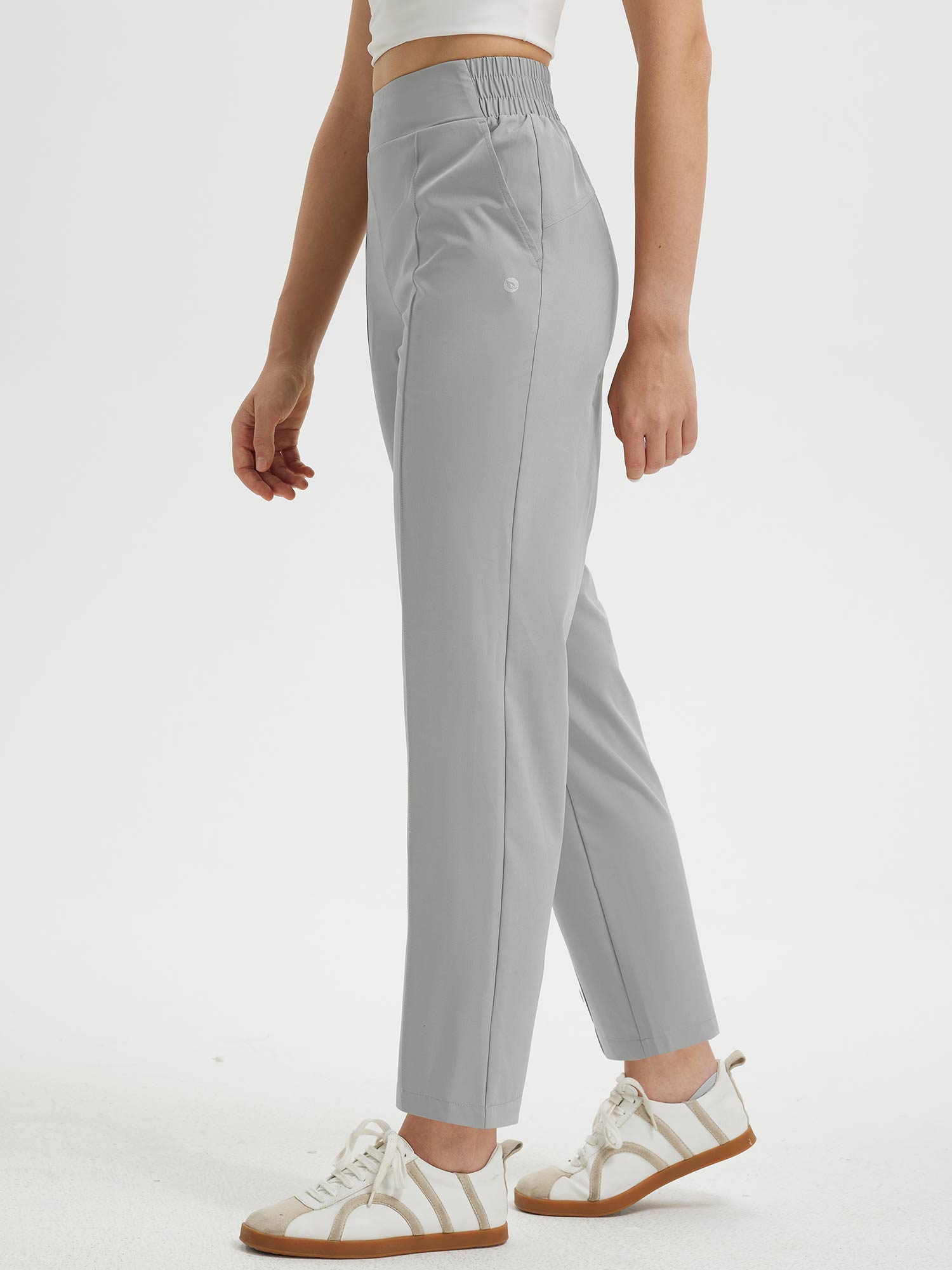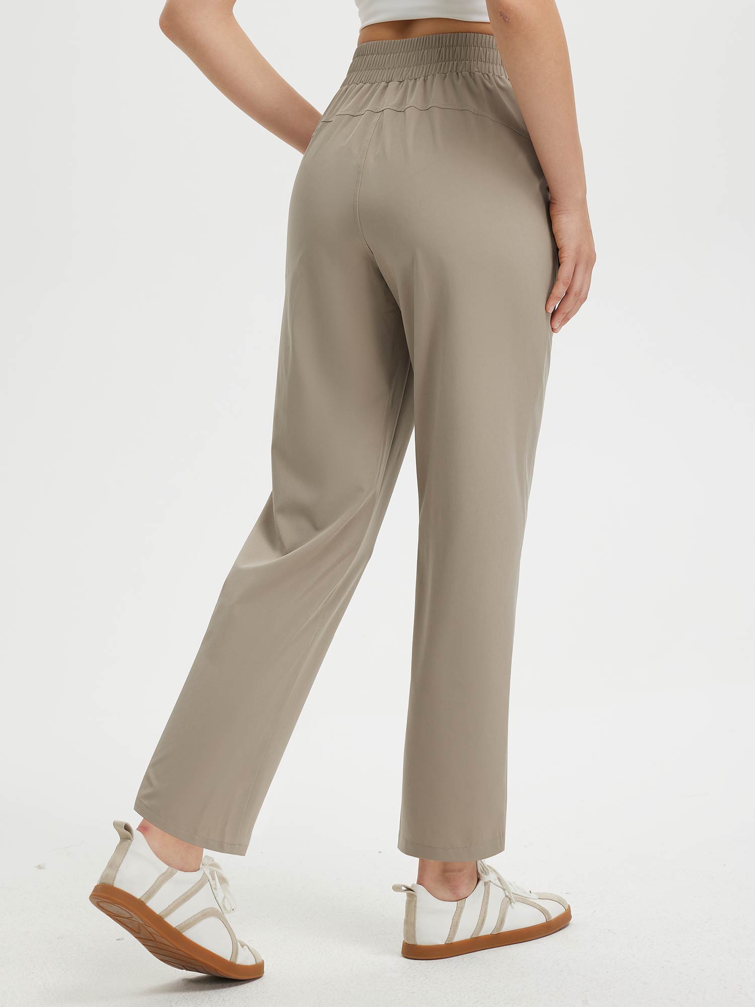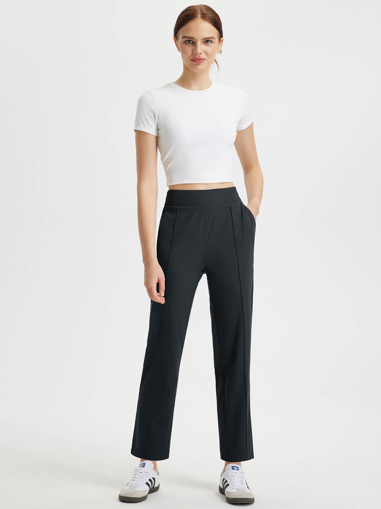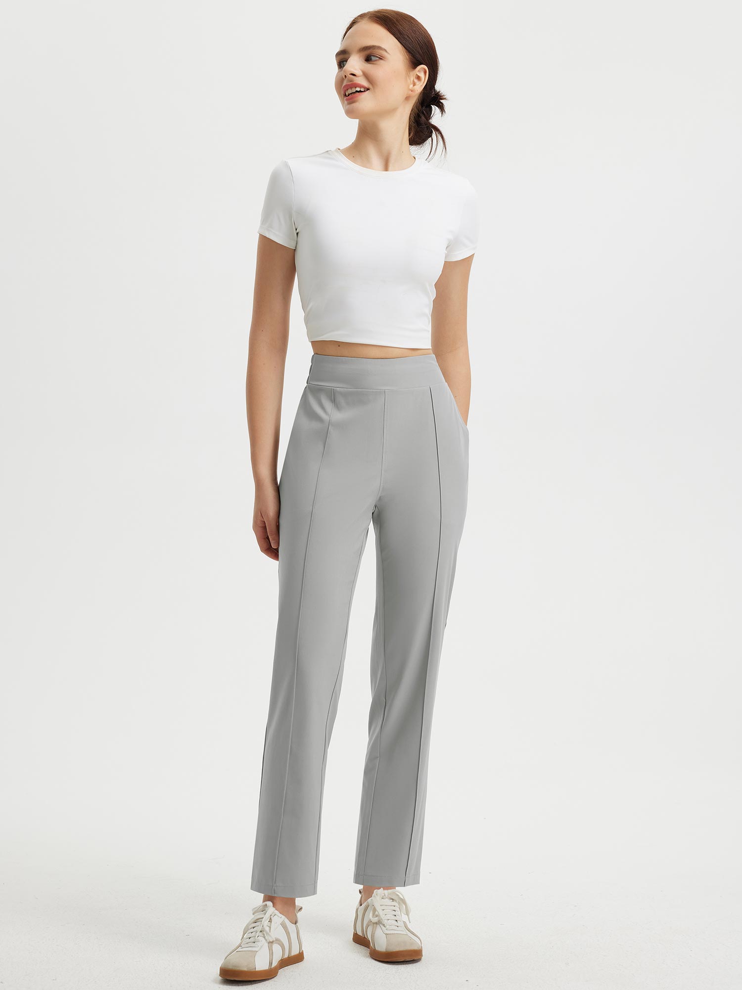- Flattering Fit: Slim. ankle-length design with a center seam elongates the legs. The flat front and elastic-waisted back offer a secure and comfortable fit that adapts to your body.