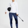 - 2.4” Wide Waistband: These riding tights with an upgrade waistband provide more coverage to the back. 2-inch flow-rise waistband is ergonomically shaped for in-saddle comfort and performance.