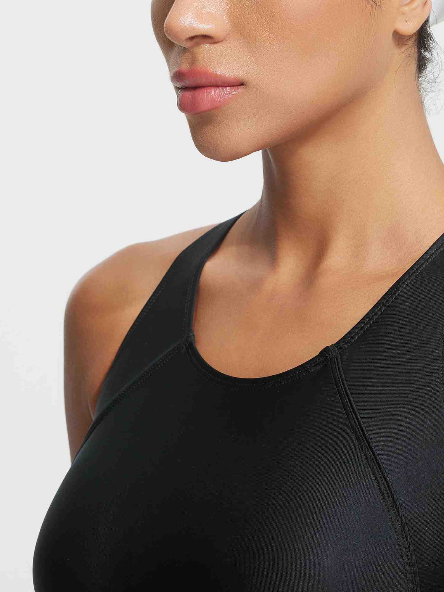 - Modest Tummy Control Swimsuit: High neckline & full coverage. Shape your swim in our Clear Lines Swimsuit. designed with eye-catching stripes and a confidence-boosting cut.