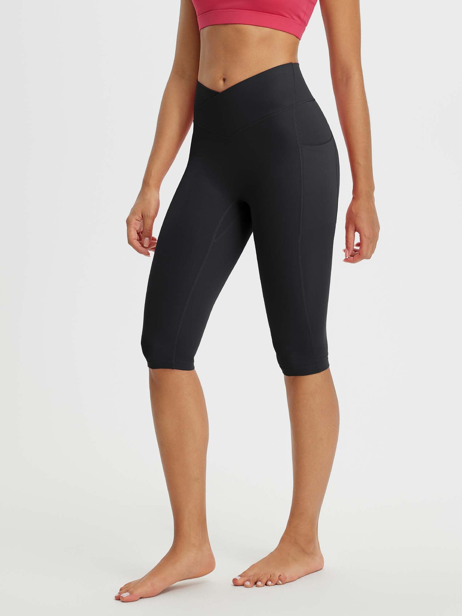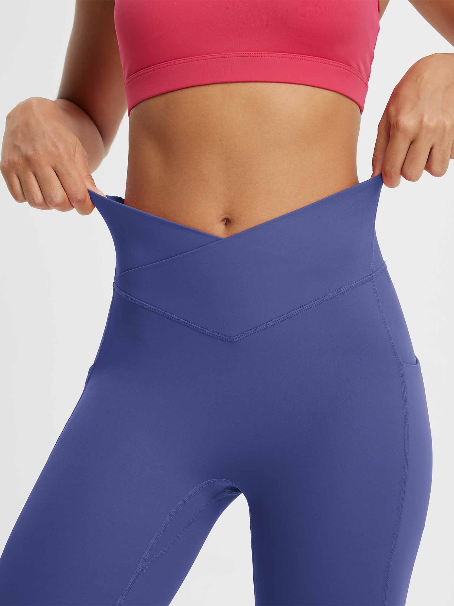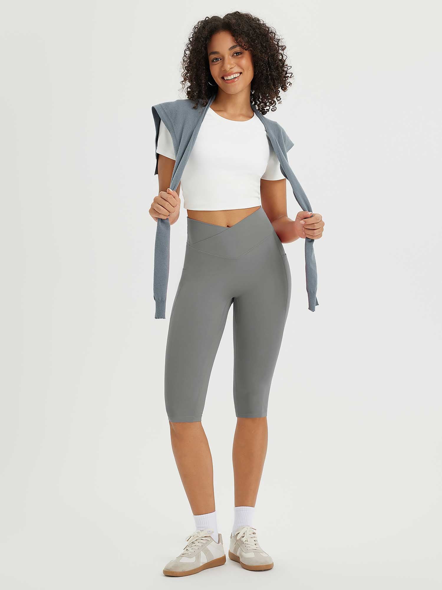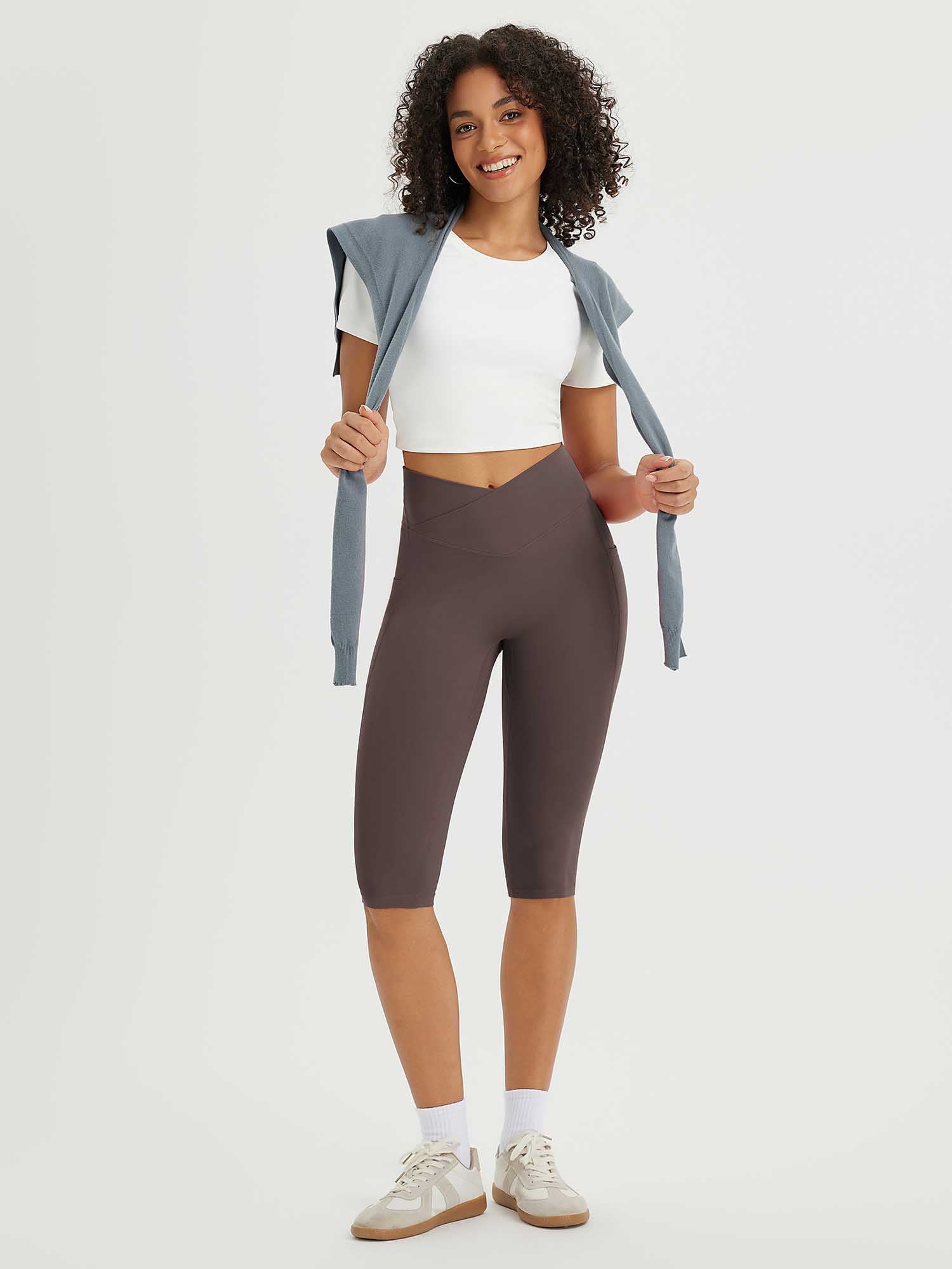 CROSSOVER WAISTBAND: Embrace the flattering embrace of our yoga capris. featuring a crossover waistband that not only accentuates your waistline but also banishes the ‘muffin top’ effect. ensuring a snug and comfortable fit around your hips
